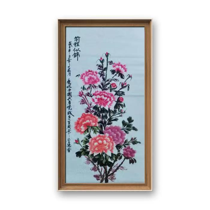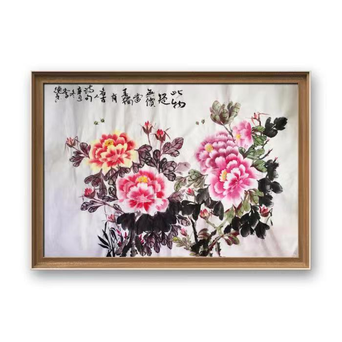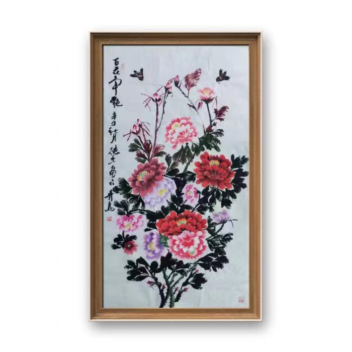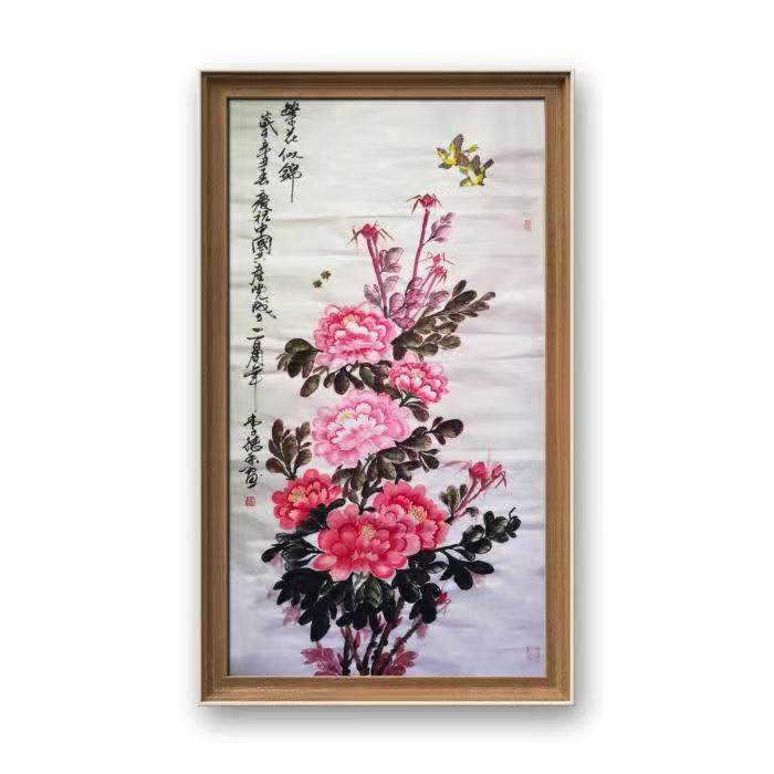 “春去花还在”,以牡丹入画,让盛开的牡丹花,定格成宣纸上永恒的美景,随时带给你视觉上的享受。硕大的花冠,一团团,一簇簇,热烈奔放。画面的色彩清新流畅,每朵牡丹如同一簇簇火苗,变动升腾,在生长动态之中带来永不消逝的希望和兴奋。牡丹花是繁荣昌盛的象征,表达了作者对盛世中国的赞美之情。