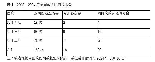 政治协商主要是通过政党协商和人民政协政治协商两种形式,参与党和国家的治理过程。就人民政协政治协商而言,党的十八大以来,协商民主制度中的一大创新便是“双周协商座谈会”制度。全国政协双周协商座谈会是一种定期协商座谈会制度,它以界别为基础、专题为内容、对口为纽带、座谈为主要方法,融专题协商、对口协商、界别协商、提案协商于一体,推动人民政协的四种重要协商形式集中呈现。除了双周协商座谈会外,全国政协还开展有专题协商、网络议政远程协商会和提案办理协商会等多种类型的政治协商议政形式。这些座谈协商围绕城乡发展、人口问题、金融发展、房地产市场、粮食生产、贸易试验区等国家发展的重要领域重要问题进行协商议政。自十二届政协开始,截至2024年5月10日,已累计举行162次双周协商座谈会、18次专题协商会和20次网络议政远程协商会(见表1)。政治协商的完善制度保障和多样的协商议政形式,在很大程度上发挥了中国新型政党制度优势。