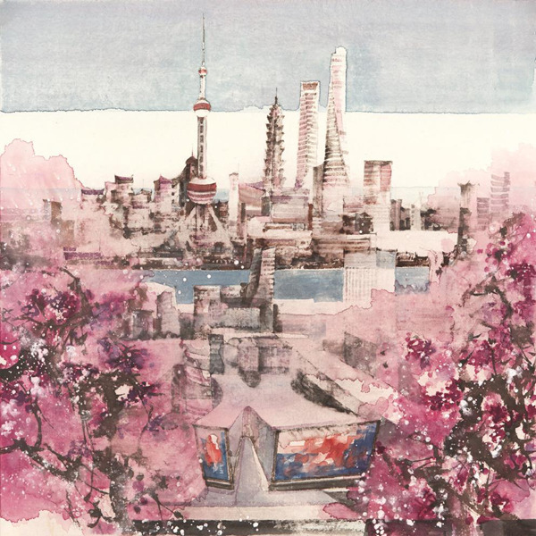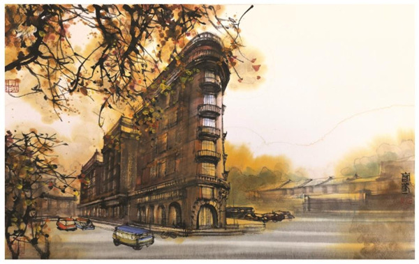 汪家芳的城市题材中国画,也颇为注重这么一种洋为中用。他的很多作品能看到传统中国画的写意、工笔乃至界画技巧,也汲取了西方古典建筑的画法,以及适度采用了一些版画、水彩语言。最终,众多优秀的中西元素由画面透出的中国意境得以贯通,呈现出大气、明快的整体意蕴,带有中国画特有的清透与留白。“希望我的作品让人一看就有中国文化的底蕴,一看就是中国画。”汪家芳说。