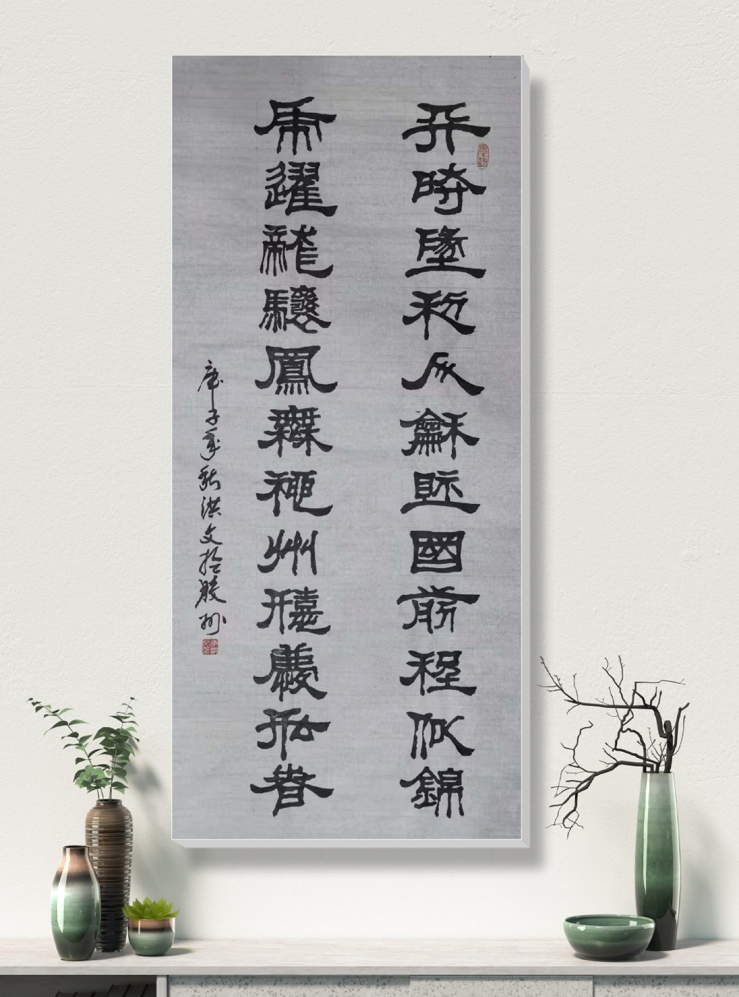 清代文字学家桂馥说过:“作隶不明篆体,则不能知变通之意,不多见碑版,则不能知其增减假借之意;隶之初变乎篆也,尚近于篆,则一变再变,若尔孙之鼻祖矣。”所以说,要把隶发展到极致,就要研究最灵动最艺术的汉隶,又必须从研究篆书入手。为此,几十年来李洪文先生深入浅出的翻阅精读了大篆(甲骨文、钟鼎文、石鼓文、满金文、六国文字)、小篆(秦篆)和众多的墓竹汉简,同时下大功夫对汉清名隶特别是《张迁碑》《曹全碑》《礼器碑》《史晨碑》《乙瑛碑》《西狭诵》《石门诵》等碑帖进行了深入细致的揣摩研习,颇具心得体悟,创作出了自己独特风格的艺术作品。