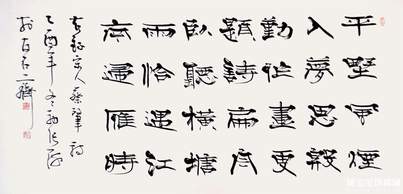 隶书又名佐书、分书、八分,是由篆书圆转婉通的笔画演变成为方折的笔画。字形为扁方,上下收紧,左右舒展。隶书讲究“蚕头雁尾”、“一波三折”。想要在隶书上有所创新,是非常有难度的,不变则失于泥古,变化不慎又成异端。
