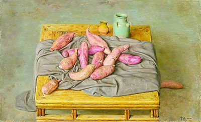 朱春林的景,常磊的物,也在表达着一个古典主义者的超然理性——“万物皆有秩序”。在看似随意截取的北方景色和窑洞里,美的秩序井然而在;在随意堆放的萝卜、红薯、藕和梨里,形色之美悄然而至。万物无贵贱,秩序赋予美——这是事实,也是信念。