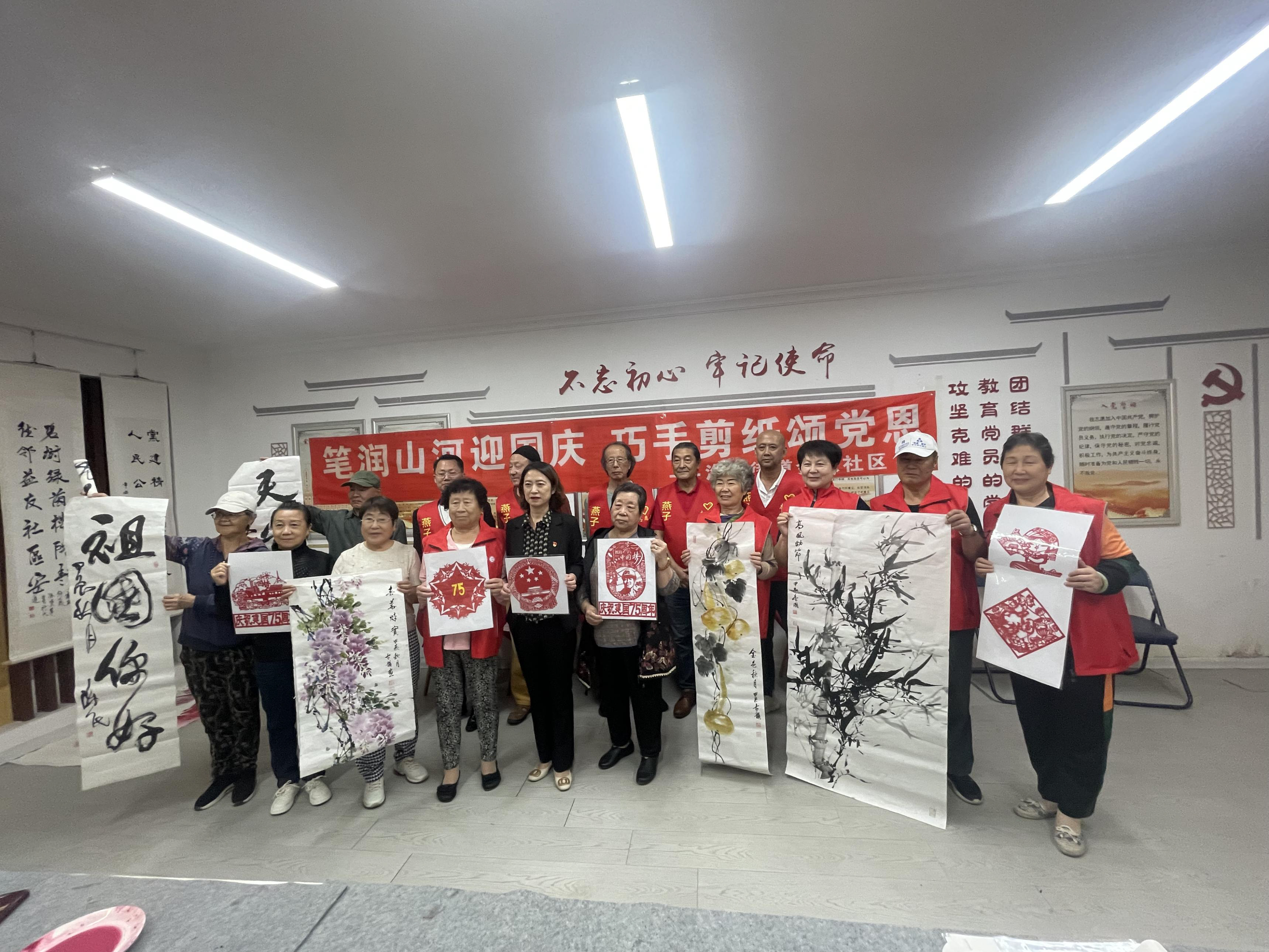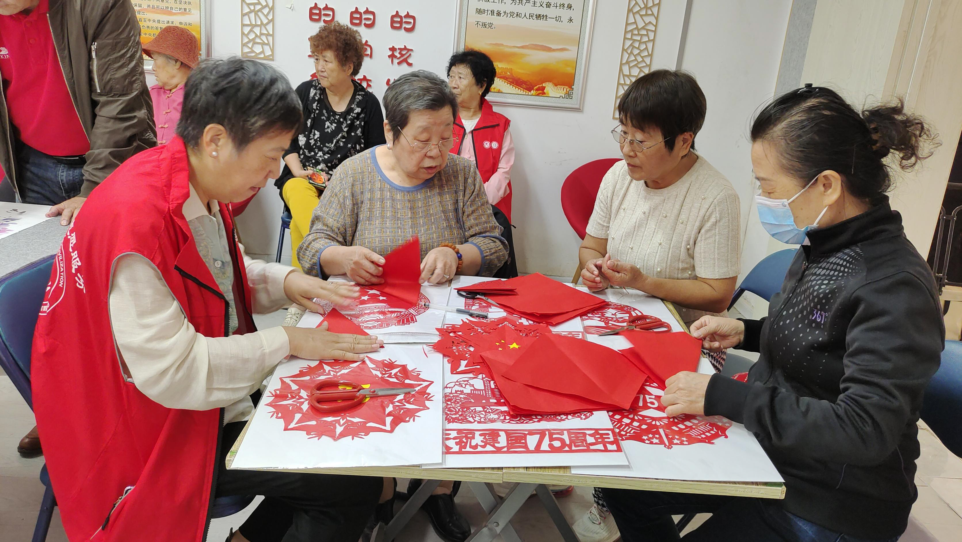 巧手剪纸映辉煌。剪纸是古老的民间艺术,具有广泛 的群众基础。活动中,洪老师带领大家用剪刀和彩纸创作 祝福祖国的剪纸作品,一张张红纸翻飞之间,一个个精美 作品相继呈现,每一幅作品都蕴含着深深的爱国之情,大 家纷纷拍照留念,脸上洋溢着喜悦的笑容。