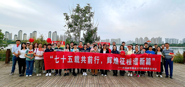 健步走活动在梅江公园开展,参与人员精神饱满、姿态昂扬,以脚步抒发爱国情怀,以行动迎接祖国华诞,充分展现了民主党派成员始终与中国共产党同心同向同行的坚定信念。活动线路沿途设计了3个答题点位,题目围绕统一战线常识、多党合作历史和中共二十届三中全会精神等内容。大家积极踊跃参与答题,深刻感悟75年来新中国和人民政协取得的伟大成就,重温中国新型政党制度走过的光辉历程。