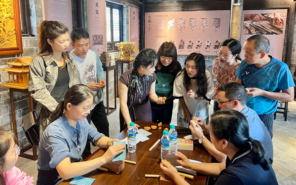 在余江韬奋小镇木雕工坊,民进会员、江西省工艺美术师徐志兰为大家详细介绍了非物质文化遗产余江木雕的历史渊源。余江木雕精湛的手工技艺、丰富的艺术内涵、深厚的历史文化底蕴引起会员的浓厚兴趣。在徐志兰的悉心指导下,会员们拿起刻刀、砂纸,自己动手感受木雕的文化魅力。