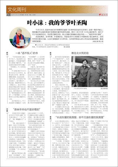 “第一部分是我所了解的一些关于爷爷的事;第二部分是爷爷和我的故事;第三部分是近年来我为一些关于爷爷的书所写的序和跋;第四部分是我参加纪念爷爷的活动时的发言——这些活动有编辑出版界的,有教育界的,有的是家乡举办的,写发言稿于我是一个很重要的任务,因为不能人云亦云,要根据纪念的主题,写真实的感触。”叶小沫向记者介绍道。