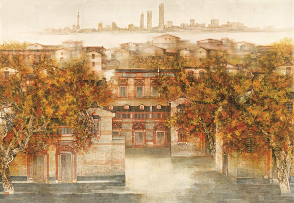 汪家芳的城市题材中国画,也颇为注重这么一种洋为中用。他的很多作品能看到传统中国画的写意、工笔乃至界画技巧,也汲取了西方古典建筑的画法,以及适度采用了一些版画、水彩语言。最终,众多优秀的中西元素由画面透出的中国意境得以贯通,呈现出大气、明快的整体意蕴,带有中国画特有的清透与留白。“希望我的作品让人一看就有中国文化的底蕴,一看就是中国画。”汪家芳说。