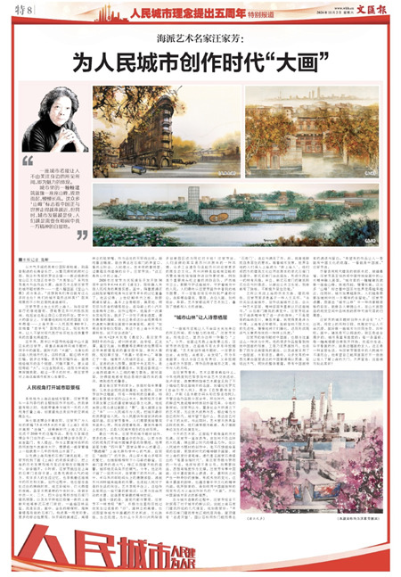 近年来,原本以中国传统绘画中山水画见长的汪家芳,将重点渐渐转向城市题材,用手中的画笔,画时代的“大画”,为身处的这座人民城市代言。这样的画,超过15米的巨幅,就多达9幅。更有数百幅作品,温情描绘城市的各个侧面,尺幅不算大,意义却担得起“大”。从出生到成长,进而为申城发展深情放歌,超过一甲子的时光,使汪家芳对上海这座城市愈发心生眷恋。