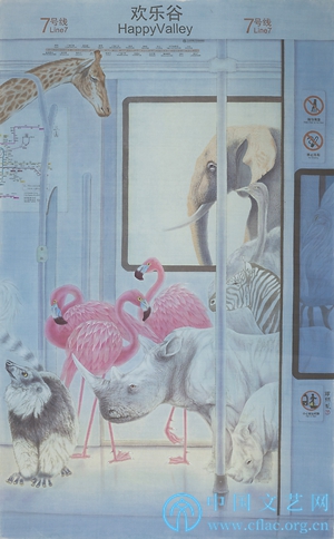 对于一位艺术家来说,在思维与实践上能辩证地处理问题,做到笔下游刃有余、有所作为,一要靠功力,二要靠修养。功力是硬功夫,没有至少十年八年磨炼打下的扎实基础,不会成气候;修养是软功夫,对艺术家来说是一辈子的事,靠读书和体验生活获得。罗翔本科和研究生都在中央美院度过,深受中央美院的“三位一体”教学体系影响,重视基本功的训练和理论知识的学习积累,同时也勇于创新和开拓新的领域。工笔画语言工整细致,但其基本精神仍属于传统意象体系,虚实、形神之间的关系仍然是工笔画创作需要不断关注和研究的课题。罗翔遵循传统工笔画的基本原理,不削弱工笔画的特色,适当吸收写意水墨的因素,赋予画面以更强的写意性,追求作品的意象性和神韵。在这一点上,他运用的方法是得体和有分寸的,这表明,他是一位善于思考和有探索精神的艺术家。我之所以强调这一点,是因为在当前包括工笔画在内的中国画创作中,有人对何为创新的认识上有所误解,以为背离传统、发挥个性是创新之道,这种认识相当肤浅。真正的创新与深入学习、研究传统不但没有矛盾,而且是刺激和促进创新的重要动力。因为传统艺术中积累的经验非常丰富,后来的艺术家认真领会了,能激活自己的悟性和创新能力。罗翔的画从传统走来,他根据自己的学习心得和体会,以及对客观自然物象的观察和研究,自由抒发感情和表达自己的心境。他的创新不是刻意求奇,而是在平常的心态中求美和力的表现。近年来,罗翔进入工笔动物画象征性表达的探索之中,这一阶段的作品是罗翔艺术创作生涯中的转折点。他在此一阶段的作品中迸发出的想象力和创造力令人称奇。对罗翔当下作品的解读是一个有趣的过程,他在画面中的一切布置和安排似乎都在考验观者的感知能力。无数的线索扑面而来,多义性的解读必然使得每一个观者都会有不一样的心理感受。他以动物和地铁车厢为主要题材,绘制了一系列“地铁”题材的作品,这一系列作品也引起了多方的广泛关注,让人眼前一亮。拟人化的犀牛、长颈鹿、大象等各种动物在地铁中出没,这样的画面足够令人感到震撼和新奇。在罗翔的地铁系列作品中,生命一片安然祥和,是一种理想的状态。一个工业社会中的“桃花源”,既是罗翔的梦境,也是我们所有当代都市人的梦境。