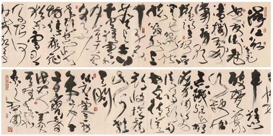 他的书法作品重线条而轻墨色,用笔多样,看似随意,实则有序。天书作品笔法更加自然随性,似藏玄机,谁能说其中没有艺术家那苦难而又辉煌的人生密码呢?