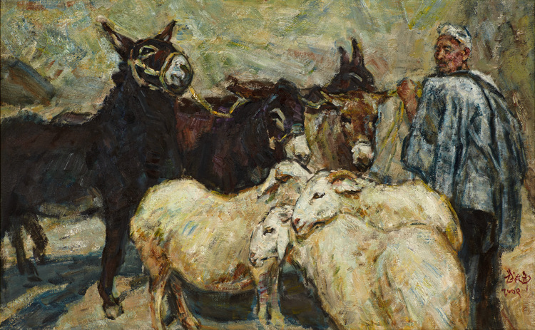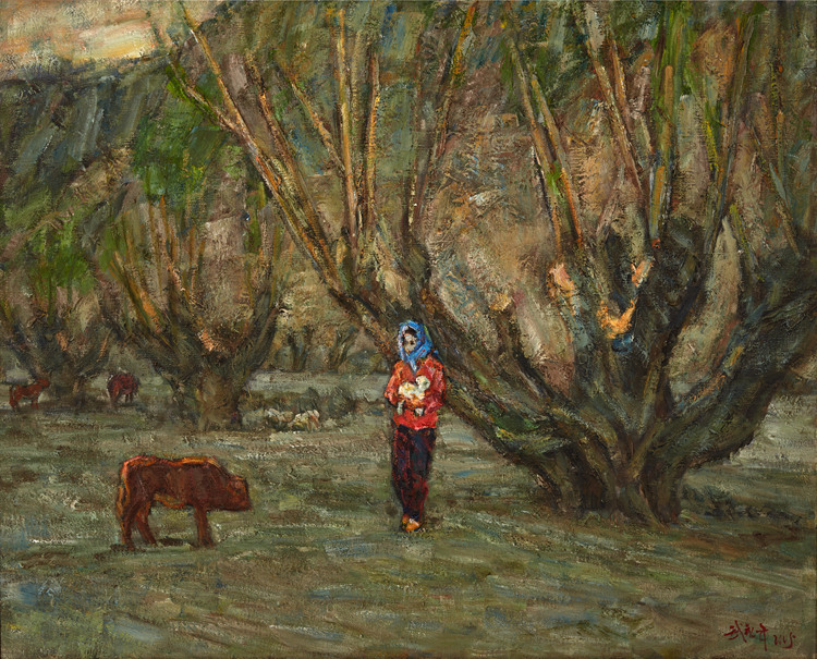他对农村生活热爱无比,对艺术同样倾心无此。在他的作品中感染人的是内在的真诚情意,表达自己内心敞开的艺术陶治,也体现了他的人生态度,含蓄隐逸。自然之景的绚丽,其温文悠淡的抒写。深耕的田园、沟壑,习空见惯的极其平凡的劳动场景,树荫、黄土、草尖、柳条、小溪流水、收割、牧羊、晨曦、暮归、赶性灵、喂毛驴、赶集、洗羊、放马、母子、爷孙、姑娘、……新时期变革后的农村自由清新的空气,农民自主安定,祥和的精神气质,那种牧歌式的生活气息,人道主义情怀的田园诗意,真切地沁人心脾。我体会到他的油画里有一种历史的存在感。这正是武老师油画艺术最不一般的特征。