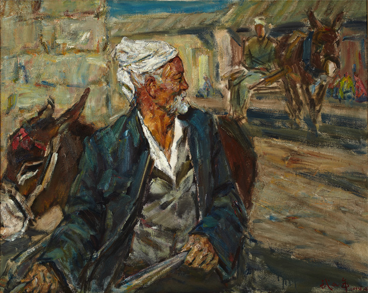 武老师上课感情充沛,神采英发。给我们宣讲罗工柳先生的教学思想:“学会了再变”。阐释现实主义油画的基本原理。鼓励我们要用色彩造形,为了不失造型的严谨,用色要把握大关系,但是在大块色彩中,色阶的变化要微妙。在塑造形象时针对我们用色简单的倾向,一再强调调色的时候一点一点的求取色阶,放在形体结构上使冷暖对比和素描关系吻合,避免生硬,造型松散。有幸在武老师指导下画了三幅人物写生:《老民兵半身像》、《坐着的朝鲜族姑娘》、《站在壁毯前的维族姑娘》。武老师自己亲笔示范。那种耐心、循循善诱、慈祥可亲的神态,记忆犹新至今不能忘怀。当《维族姑娘》作业完成后,武老师为了鼓励我,把它推荐到学院陈列馆长期展出。1966年红色风暴骤起,陈列馆被砸烂,我的这件留校习作也被人用匕首把人物的脸部捅了一个大口子。