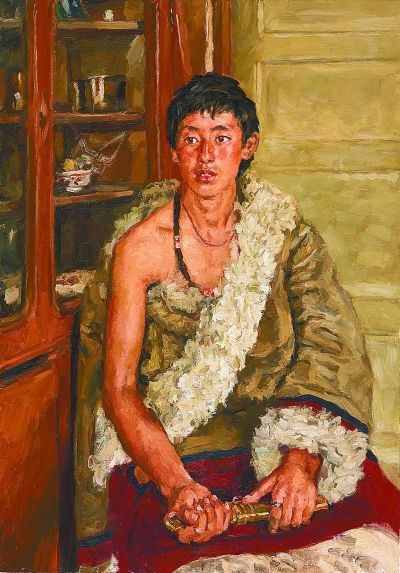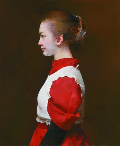 这种超然物外的姿态,在展出的肖像画中也同样表现出来。杨飞云的《簪花仕女图》维系着他的新仕女肖像惯有的“可远观而不可亵玩”的距离感,即令走出画室深入百姓生活所画的普通人系列肖像中,肖像人物虽然已经嵌置于其生活的空间,但直视的目光,还是让人感觉到了互为“他者”的陌生。徐芒耀的《英子》、郭润文的《萌娃》、李贵君的《迷失》、朱春林的《报喜天使》、常磊的《美卉》画的全是女孩,又何尝没有这种难以言说的距离和超然呢?郭润文给他画的一幅红衣女青年的侧面肖像取名为《距离》,他要刻意保持的距离,到底是什么呢?没有距离,就没有超然物外的姿态,也就失去了艺术的表达。因此,七位油画家洁身自好的距离和超然,便获得了坚守艺术的诠释,因而弥足珍贵。