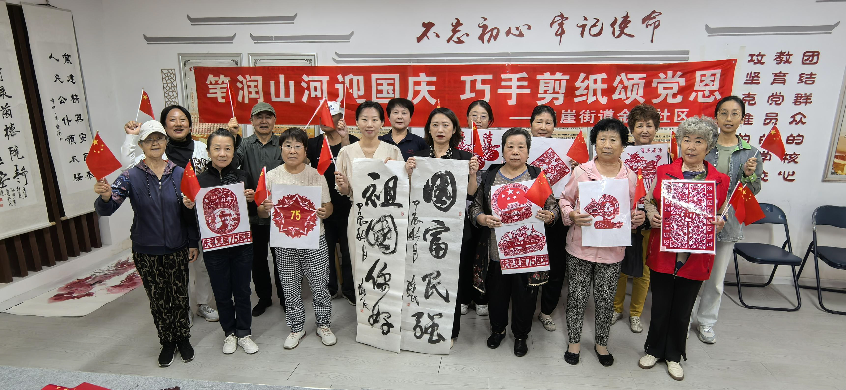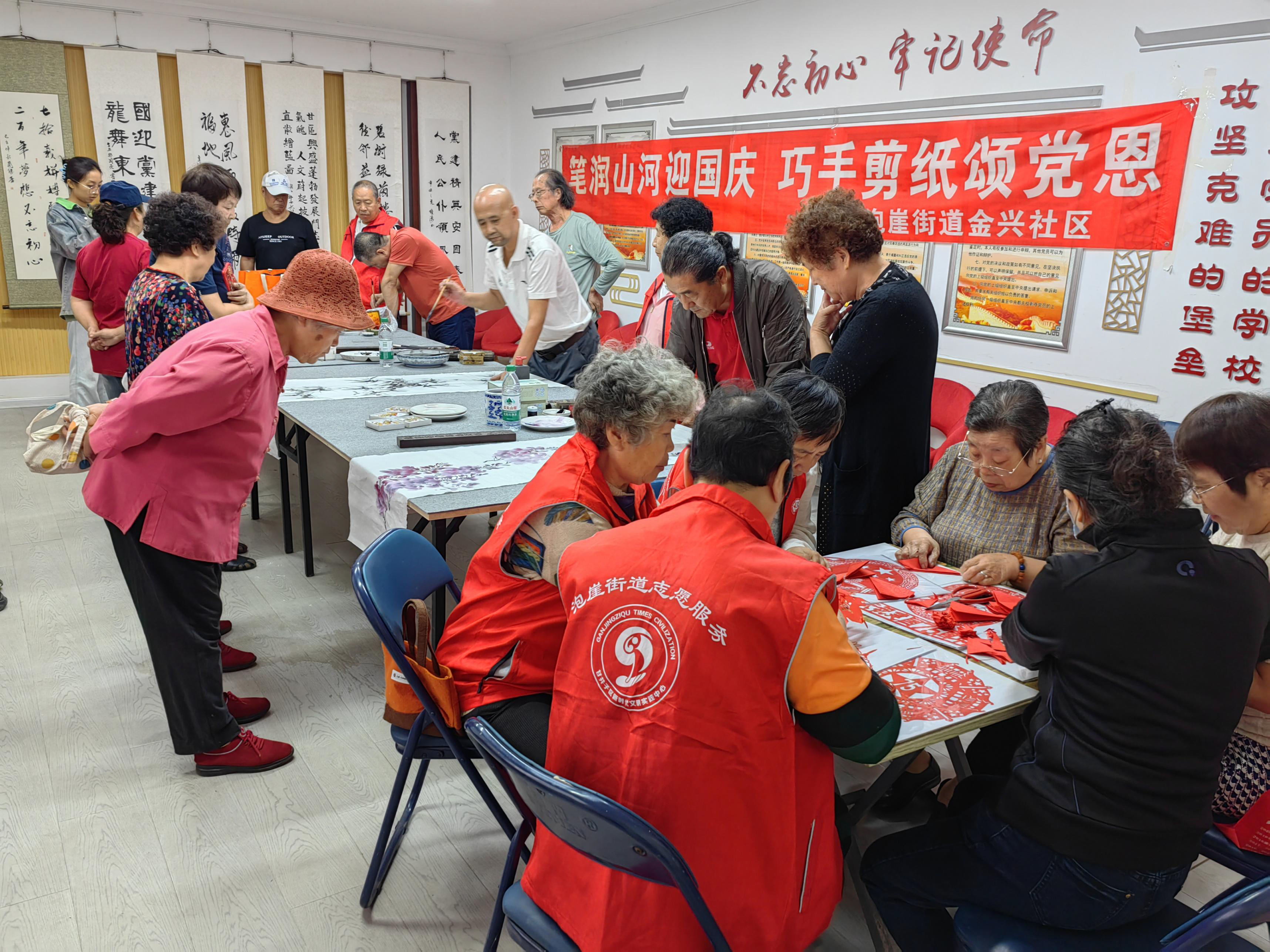 巧手剪纸映辉煌。剪纸是古老的民间艺术,具有广泛 的群众基础。活动中,洪老师带领大家用剪刀和彩纸创作 祝福祖国的剪纸作品,一张张红纸翻飞之间,一个个精美 作品相继呈现,每一幅作品都蕴含着深深的爱国之情,大 家纷纷拍照留念,脸上洋溢着喜悦的笑容。