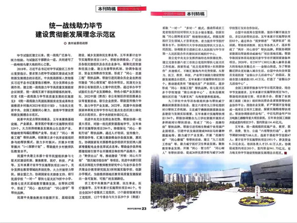 2018年,习近平总书记对毕节试验区工作作出重要指示,要求努力把毕节试验区建设成为贯彻新发展理念的示范区。中央统战部深入贯彻落实习近平总书记重要指示精神,充分发挥牵头协调作用,建立统一战线助力毕节高质量发展联席会议制度、统一战线互派干部挂职锻炼机制等,印发《统一战线助力毕节高质量发展的实施意见》《统一战线助力巩固拓展脱贫攻坚成果和全面推进乡村振兴2023年项目计划》,与各民主党派中央、全国工商联同心聚力,助推毕节建设贯彻新发展理念示范区。
